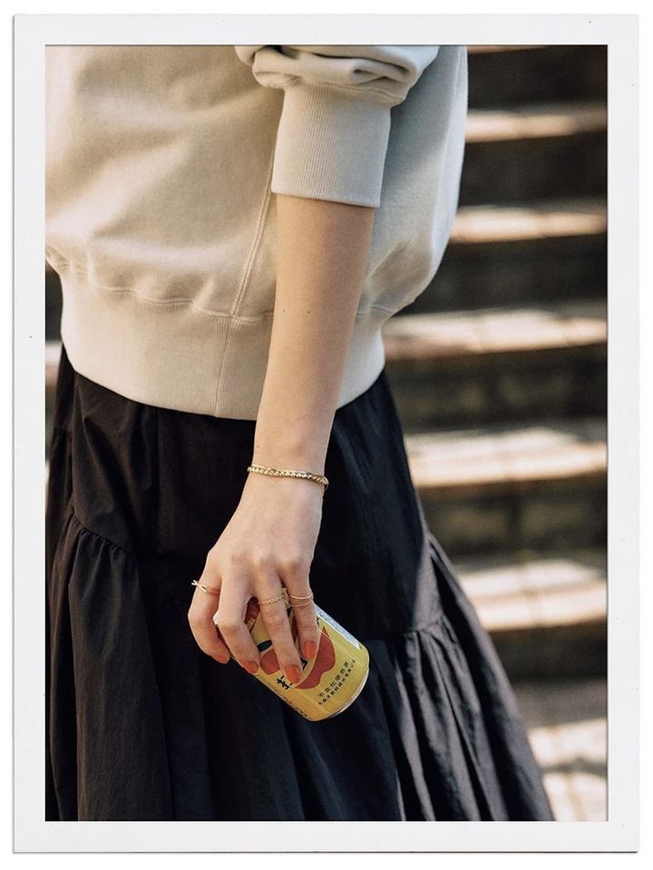 たくし上げたそでまわりに女性らしさを宿す、繊細に重ねたゴールドジュエリー。ハートチェーンのブレスレットや構築的なシルエットのリングなど、きゃしゃな中で冒険心を。