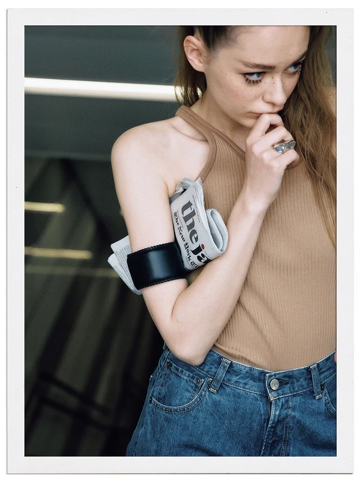 タンクトップを生かした新たな飾り方として、太いバングルを二の腕にセット。そもそも引き締め力が高い黒レザーなら、隠す以上に腕をすっきりと見せてくれる効果が。肌なじみのいいキャメルのタンクトップに、強気なメリハリがつく。