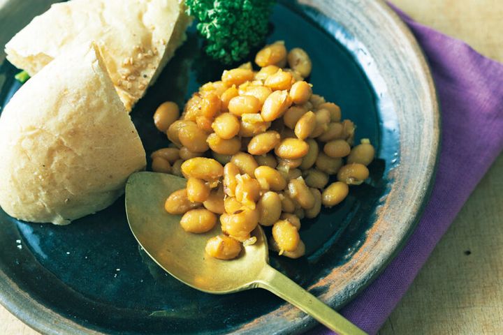 1. フライパンにオリーブ油を熱し、にんにく、しょうが、クミンを入れ、香りが立つまで炒めたら、大豆を入れる。