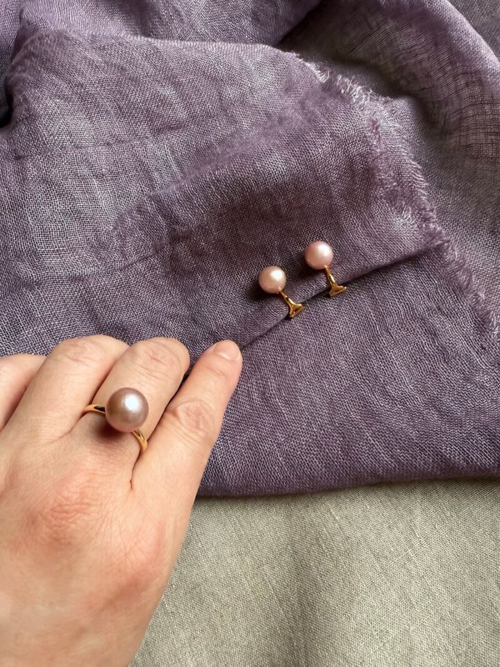 ある日、ピンク色の大きな淡水パールに一目惚れをしました。可愛い、可愛い、ピンク色の丸いもの、これは堪りません。天然の色は一言では言い表せない深みがあります。そのピンク色は、光が射すと紫色にもグレーにも見える美しさです。そして、わたしの手は「歳相応で良いのだ」と思わせてくれるリングを得ました。いかがでしょうか?