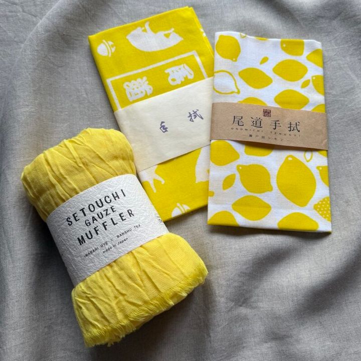 尾道を訪れた際に、手ぬぐい屋さんで買い求めた尾道のレモンと、尾道の猫の手ぬぐいです。使うのを惜しんでいましたけれど、この夏はガーゼマフラーと一緒にバッグに。撮影で訪れた深い秋を模した尾道の記憶と、友と訪れた暑い季節の旅の記憶が交錯します。