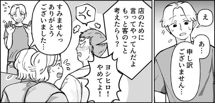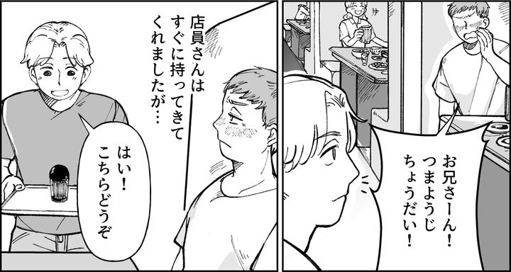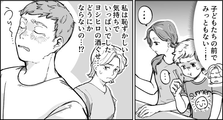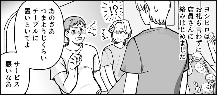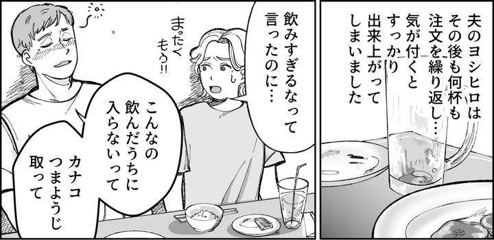 ヨシヒロはお酒が入ると態度が大きくなって、翌日になると覚えていないのです。だから外で飲んでほしくなかったのに……! 私の制止も聞かずヨシヒロはすっかり出来上がってしまいました。しまいには「つまようじがない」と店員さんに絡みだします。せっかく家族での久しぶりの外食なのに、私は恥ずかしくてたまらなかったのでした。