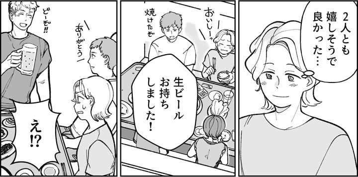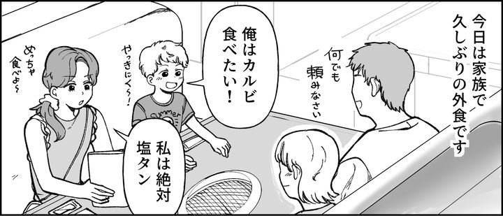 私はカナコ。夫ヨシヒロと高校生の娘ホマレ、小学生の息子タケルとの4人暮らしです。今日は家族で焼肉店に来ました。ホマレがテニス部の大会で頑張ったのでそのお祝いです。家族で外食なんて久しぶりなので、子どもたちも喜んでいます。ただ私には心配ごとがひとつ。ヨシヒロは酒グセが悪くて、飲むと記憶をなくすのです。人に絡んだり、暴言を吐いたりすることもあるので恥ずかしいです。今日はお酒は控えてもらおうと思っていたのですが……。