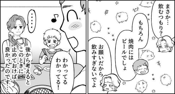 <酒グセの悪い夫>だから飲むなって言ったのに…「焼肉にはビール」店員さんに絡む夫【まんが】