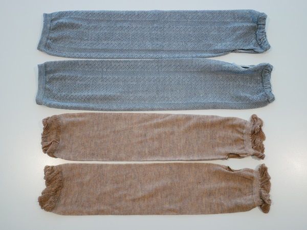 「アームカバー48cm丈透かしフリル柄」はもっと長く、普通の半袖を着てアームカバーをつければ、隙間なく肌を覆えます。こちらは細かい穴がたくさん開いた生地なので少し涼しいですが、UVカット加工はありません。