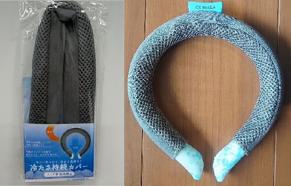 写真説明:「リング状保冷剤用冷たさ持続カバー」のパッケージ(左)と、自宅にあった保冷剤に装着してみたところ(右)