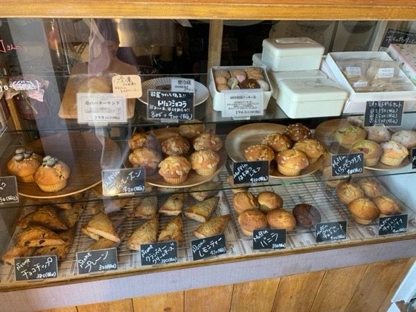 店内に入ると、マフィンやスコーン、季節の果物を使ったお菓子が正面にズラリと並んでいて、背面にはマドレーヌやフィナンシェ、クッキー等の焼き菓子が並んでいます。
