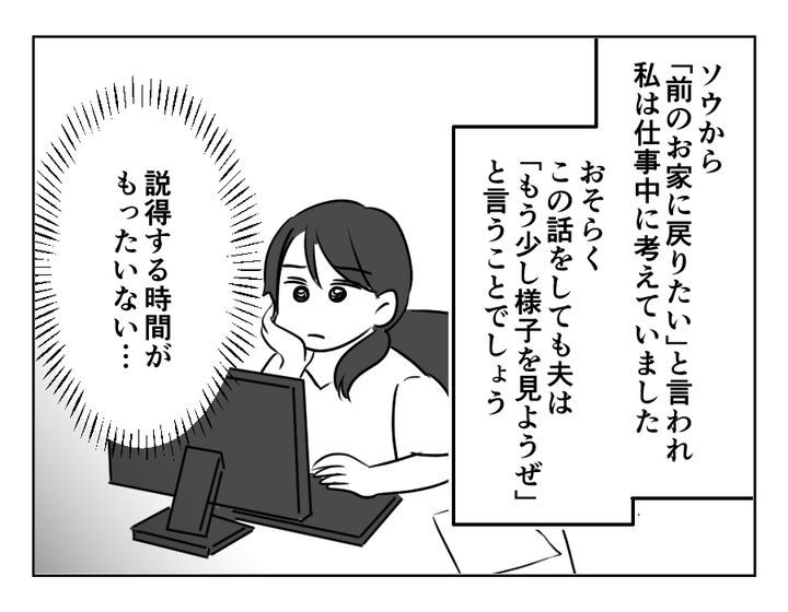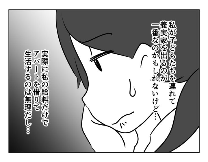 ソウくんの悲痛な訴えがあっても、リュウさんは「様子を見よう」と言うに決まっている。チナツさんはもはやリュウさんに期待していません。となれば、チナツさんだけでも子どもたちを連れてひとまず義実家を出ればいい……そうしたいところですが、実際にチナツさんだけの稼ぎでは子ども2人も育てられないし、現実的ではありませんでした。何かいい解決策はないか……同居解消のことばかり考えてしまうのでした。