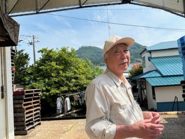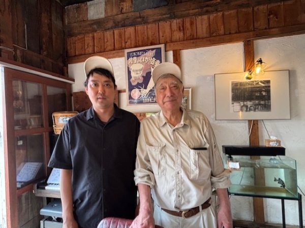 温かみあふれる3代目小田島隆社長と4代目営業部長章喜さん。社長さんが被っているイカの刺繍帽子も購入可能でした。