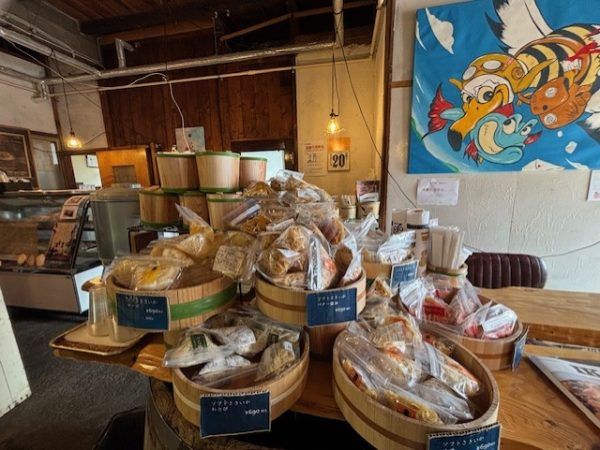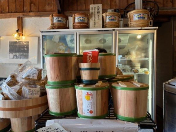 木樽仕込みのミニ樽塩辛などスタンダードな塩辛の他、アレンジメニューの塩辛deパエリアやアヒージョなど食べてみたくなる商品が並んでいます。工場見学者だけでなく直売所での観光客のみなさんも、スタッフさん、社長さんにも直接聞いて納得して購入できるアットホームな雰囲気なお店でした。