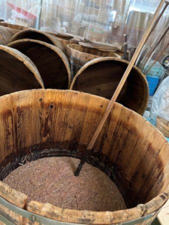 杉樽での熟成、樫の木の棒ででかき混ぜ、空気を入れ発酵が進む過程を見るだけでなく、香りも感じ取れるのが見学ならではの良いところ。着色料を使わず、自然の色、桜カラーは、この木樽ならではの仕上がりのようです。