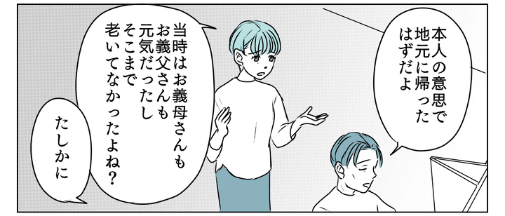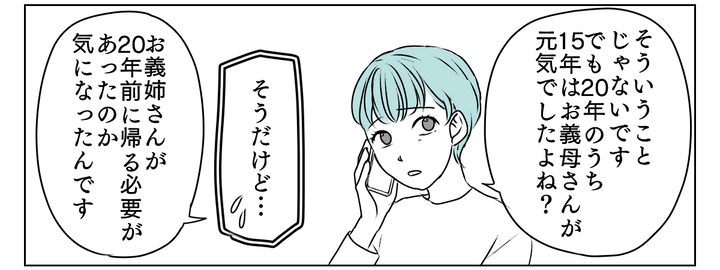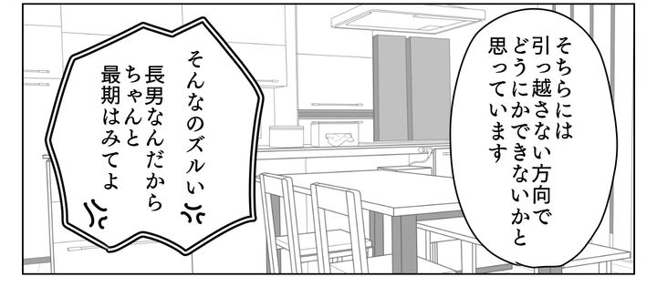 「そちらには引っ越さない方向で、どうにかできないかと思っています」引っ越しを避けたい私は、ここは譲れないと思って毅然と言いました。「そんなのズルい。長男なんだからちゃんと最期は見てよ」責任をなすりつけるような義姉の言い方にカチンときた私は、「お言葉ですけど、これまでの20年とこれからの20年はちがうと思います」と思わず言い返しました。