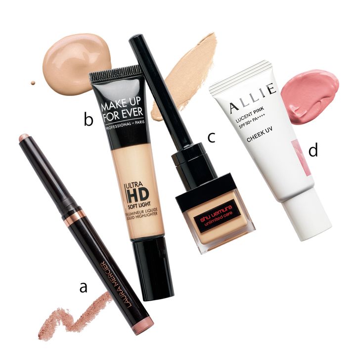 チークの血色で茶グマをカモフラージュして自然にカバー。a.ローラ メルシエ キャビア スティック アイカラー N 1.64g R02 ¥3,850(ローラ メルシエ ジャパン)b.ウルトラHDソフトライト 30 12ml ¥4,840(メイクアップフォーエバー)c.アンリミテッド ケア フェイス カリグラフィー 13g 5ライト ¥7,260(シュウ ウエムラ)d.アリィー クロノビューティ カラーオンUV チーク02 15g ¥1,760〈編集部調べ〉(カネボウ化粧品)