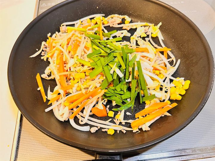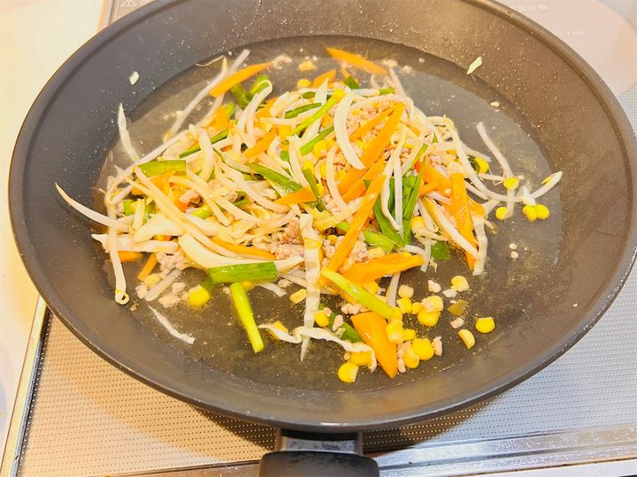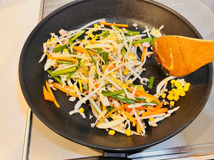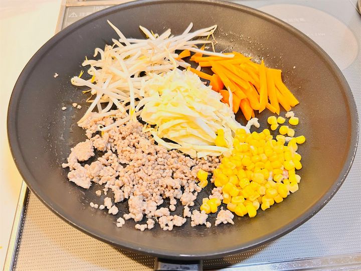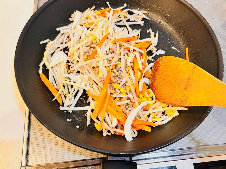 豚ひき肉の色が変わったら、1のにんじん、キャベツ、もやし、コーンを加え、中火のまま炒めます。
