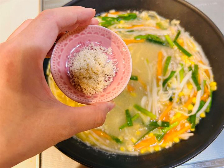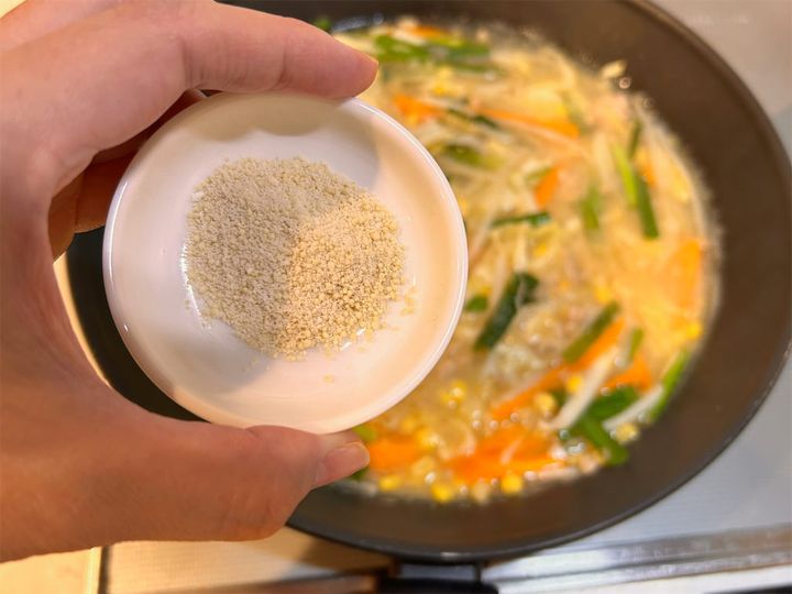 5. みそが溶けたら火を止めて、鶏ガラスープの素を加えます。