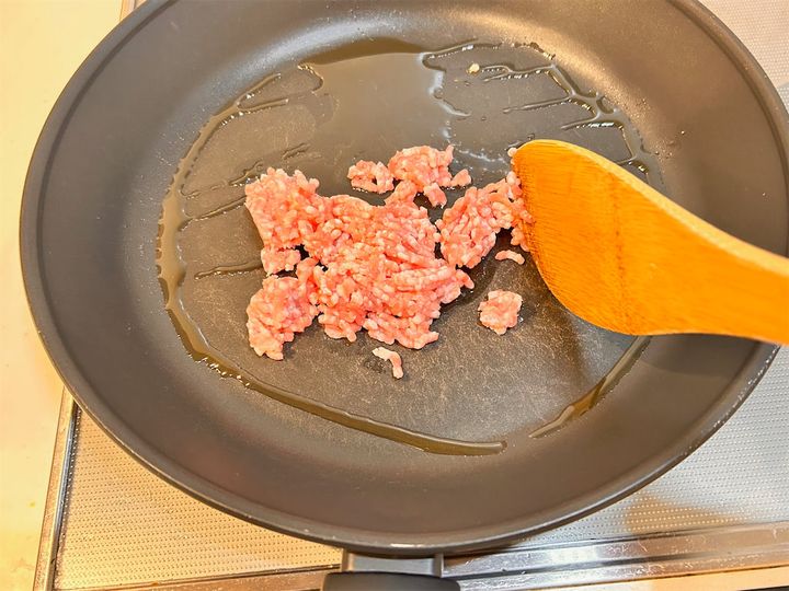 中火で豚ひき肉を炒めます。