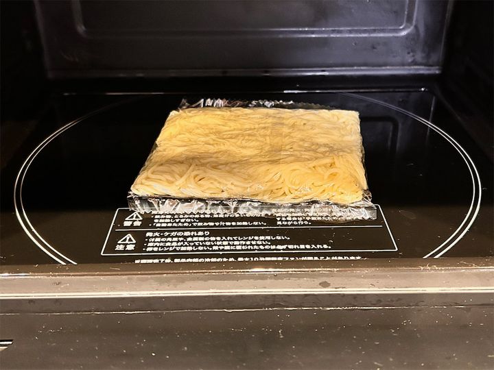 7. 焼きそば用の麺を、袋のまま電子レンジ600Wで2分ほど加熱します。