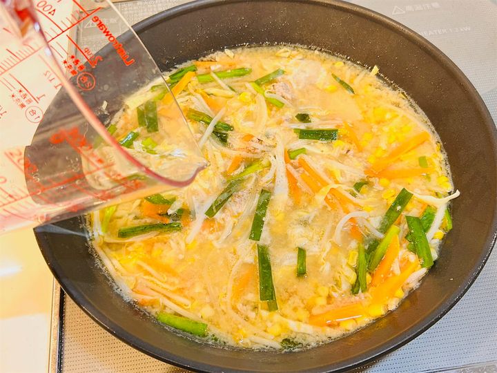 スープを丼に注ぎ、レンチンした袋麺を添えれば完成です!
