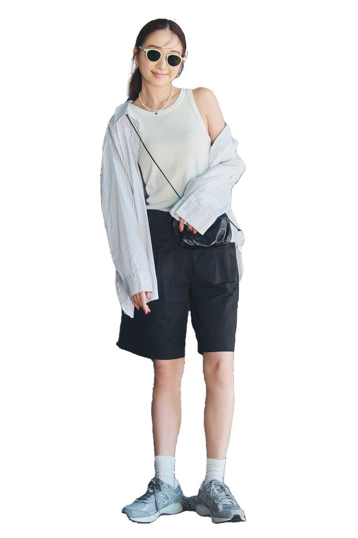 ハーフパンツとリブタンクに、オーバーサイズのストライプシャツを羽織って。スニーカーとソックスでリラックス感もありつつ、都会的な雰囲気をキープ。アクセ使いで女っぽさも忘れずに。