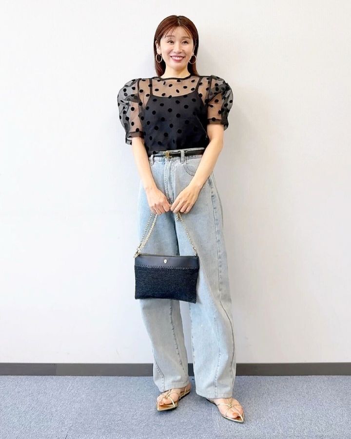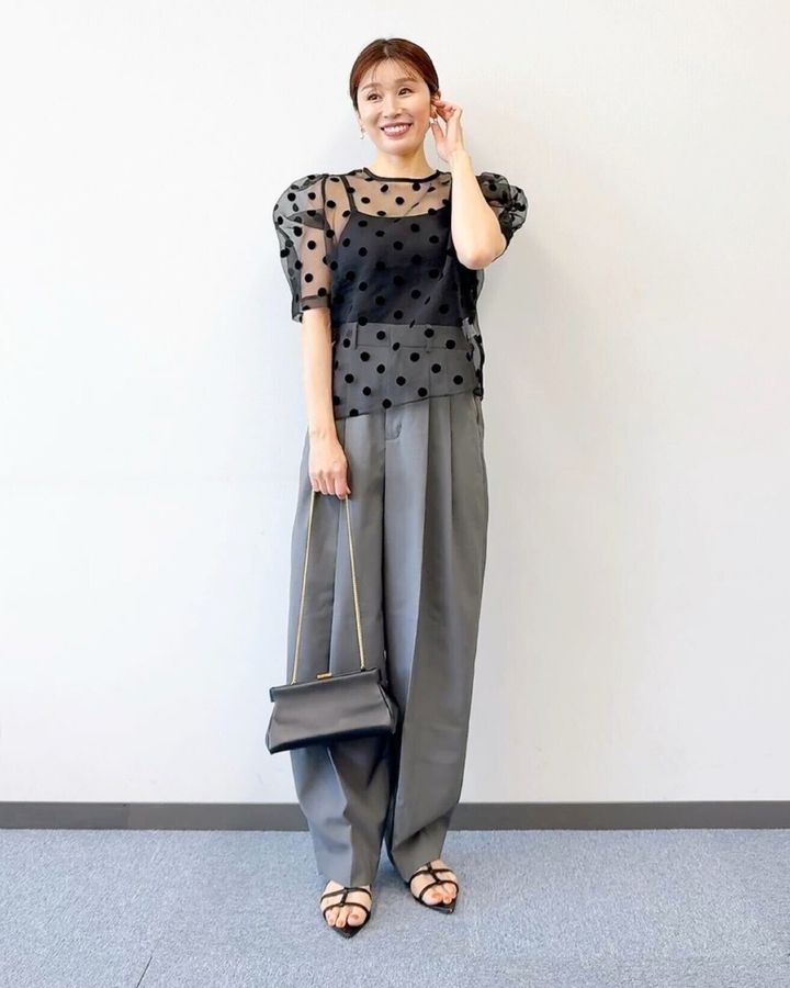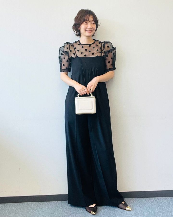 透け感のあるデザインは、黒ドットが施されており、シンプルながらもエレガントな印象に。オールブラックにすればオケージョンにも使えそうです。
