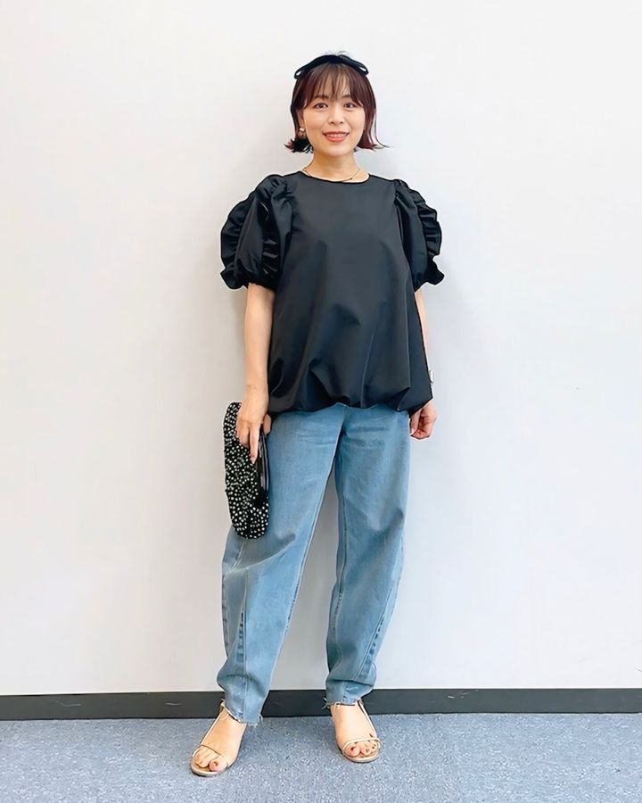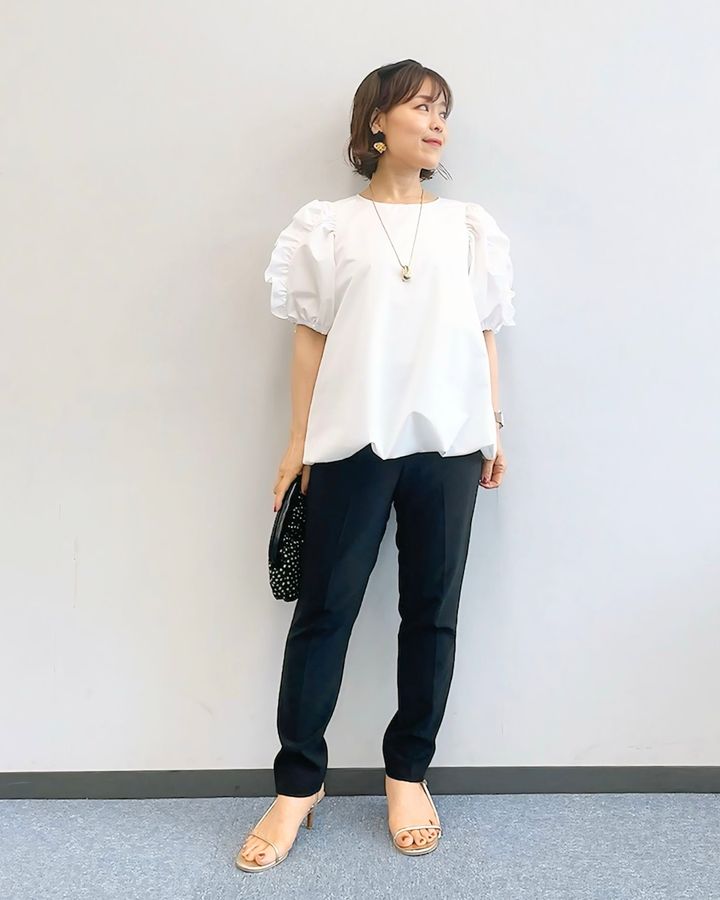 裾のバルーンデザインとボリューム袖が華やかなブラウス。手持ちのパンツ合わせるだけでオシャレなコーデが完成します♡キレイめなパンツはもちろん、デニムとも相性◎。上半身が華やかになるので、お食事のシーンに映えること間違いなしです!