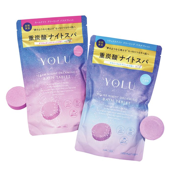 重炭酸を含んだお湯が体を芯まで温める。心安らぐアロマフレグランスが睡眠環境をサポート。(左)上品な甘さのダフネ&サンダルウッド。ヨル カームナイトドリーミング バスタブレット(右)清楚で落ち着きのあるカモミール&ヒヤシンス。ヨル リラックスナイトドリーミング バスタブレット 各40g×6錠入り 各¥1,760(ともにI-ne)