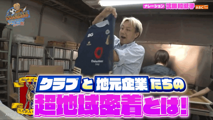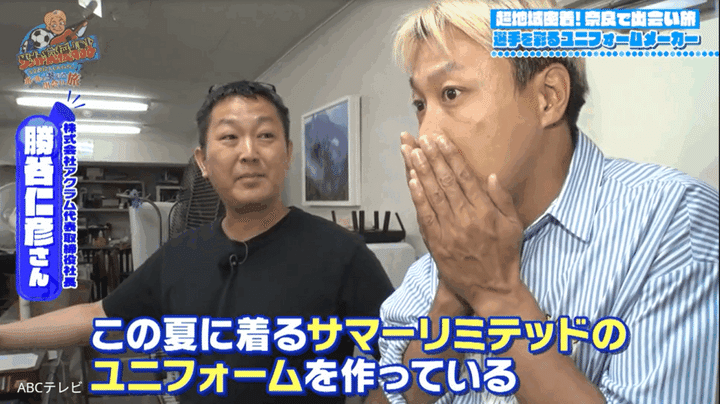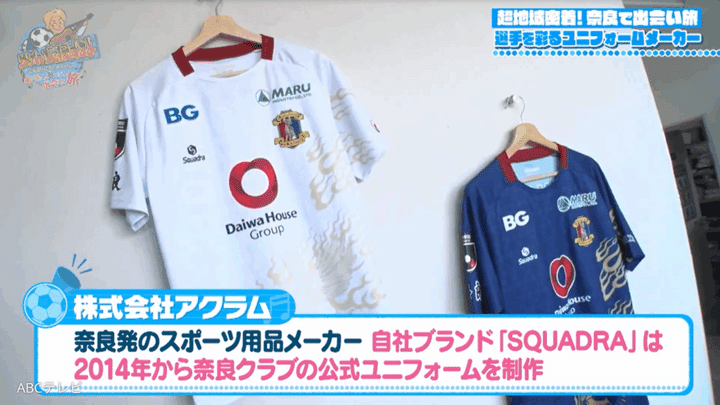 しんいちが訪ねた“超地域密着企業”のひとつ、株式会社アクラムは、「SQUADRA」というブランドで奈良のプロチームや全国の大学・高校にユニフォームを販売している奈良発のスポーツ用品メーカー。もちろん奈良クラブのユニフォームも手掛けていて、この日はサマーリミテッドバージョンを作っている真っ最中!