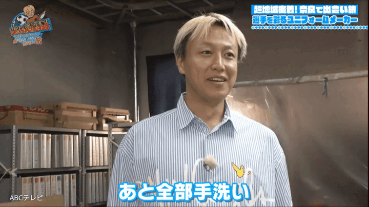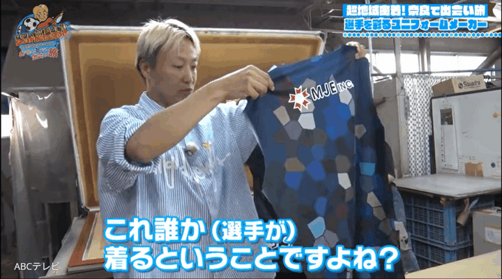 こうしてプリントされた生地が縫製され、ようやく1枚のユニフォームが完成する。「機械でポンポン出てくるわけじゃなくて、結構人の手がかかっています」と社長。その言葉に、「1枚1枚、全部違うってことですよね。最後は手作りやから」と大変さを痛感したしんいち。