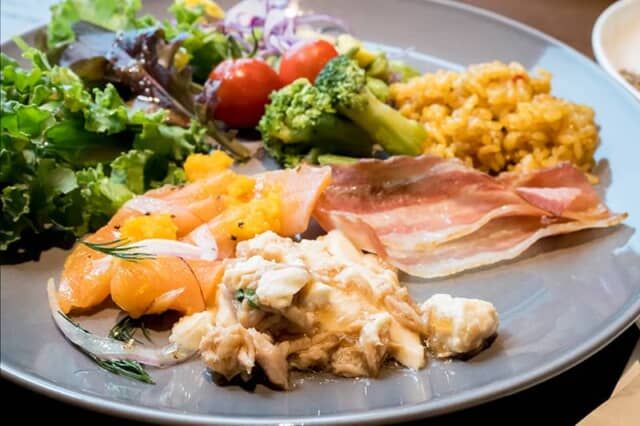 彩り豊かなサラダやブロッコリーに加え、ヘルシーな「豆腐とツナのサラダ」や食欲をそそる「スモークサーモンカルパッチョ」、ベーコンや「ドライカレー」などを盛り付けてみました。