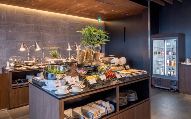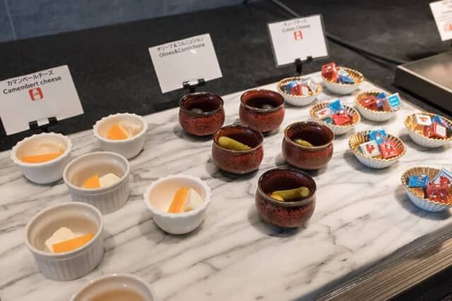リフレッシュメントタイムは11時~17時までで、連泊するゲストなら午前中から利用できます。フードカウンターには一口サイズのクッキーやマドレーヌ、気軽につまめるナッツ類に加え、有名な和菓子も登場し、ドリンクと共に楽しめます。