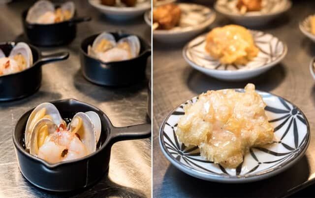 温かい料理は「おぼろ茶碗蒸し」や「エビとあさりのアヒージョ」、「鶏天」などホテルメイドのメニューが並びます。