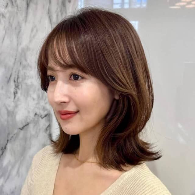 前髪は“透け感バング”がおすすめ。おでこが少し透けるくらいの軽さを出すと視線を上に向かせることができるので、スッキリ小顔感もUPするでしょう。