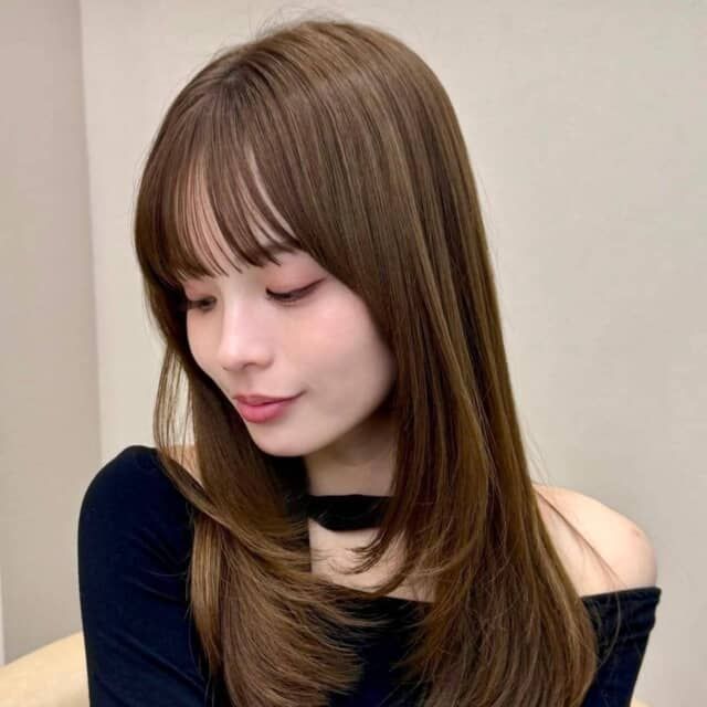 長さに変化がなくても立体感が出て、ヘア全体が動いて見えるのが魅力です。明るすぎず暗すぎない“6〜8トーンのラテ系カラー”なら、大人っぽくツヤ感も引き立つはずです。