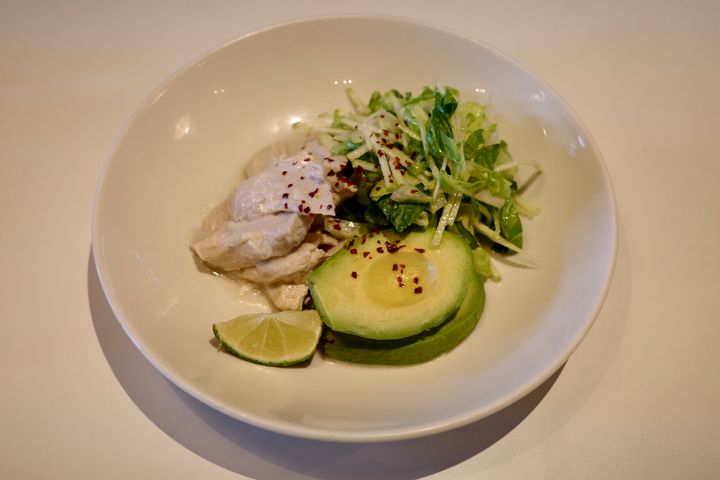 贅沢に半分入ったアボカドと、グリーンアップルやクレソンのサラダに、