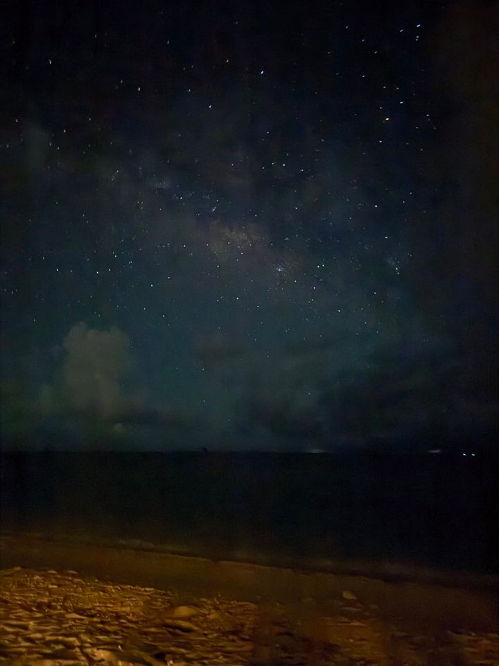 ちなみに、国内で初めて星空保護区に認定された西表石垣国立公園内に位置するこのホテル。「はい(南に)むる(群れる)ぶし(星)」というホテルの名前の由来になっている通り、このエリアでの見どころはなんといっても「星」。小浜島より南には強い明かりを発する地域がないため、水平線ぎりぎりまで暗い夜空が広がります。そして、この写真は撮影当日に剛力さんのスマホカメラで撮影したもの。肉眼ではもっともっと無数の星たちが輝いていて、小一時間ほど空を眺めていました♡(ちなみにこの日は、流れ星も発見!)