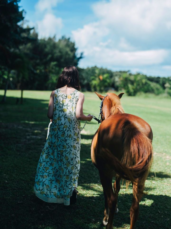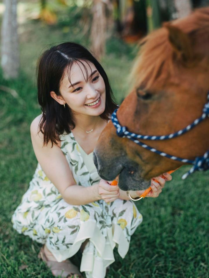 ここ「はいむるぶし」には、水牛やヤギ、アヒル、リクガメなど多種多様な動物が生息しているのも特徴のひとつ。なかでも馬の「さんぴんちゃん」はリニューアル前から「はいむるぶし」にいる名物馬。一緒にお散歩をしたり、ブラシをかけたり、エサを準備したりして“今日も暑い”と語りかける剛力さん。10分足らずですっかり仲よくなったご様子!
