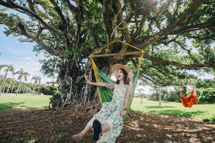 敷地の中には、至るところにハンモックが。夏の日差しが強い沖縄ですが、木陰に入ると涼しく、海風を感じられ、これがまた心地いいんです! お気に入りスポットを探しにカートでブラブラしてみましたが、中でもガジュマルの樹の下のハンモックが写真映えしてイチ推し♡ 行った際には、ぜひこのハンモックを探してみて!