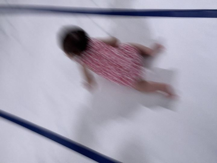 ハイハイが速すぎて、もはや残像しか写っていない姿に思わずクスッと微笑んでしまいます。写真のアングルも絶妙で、まるで遠心力を味方につけたコーナリングを彷彿とさせますね。