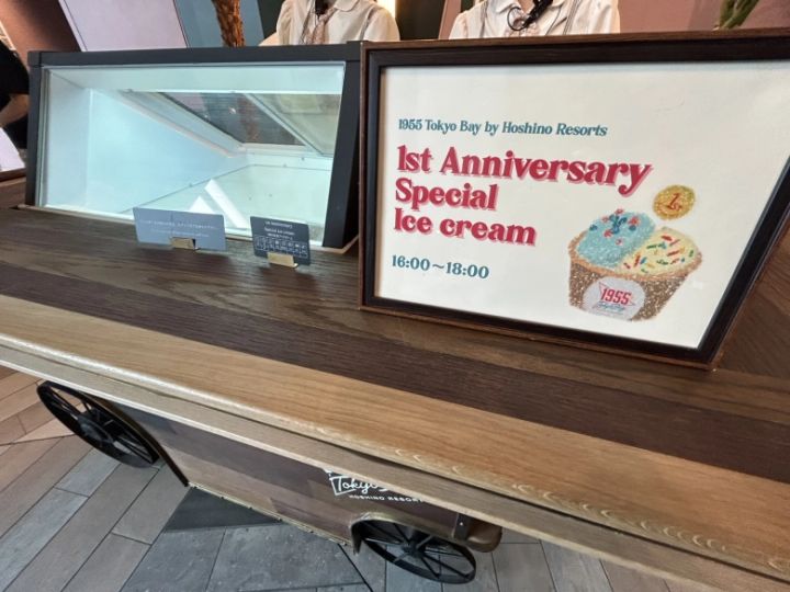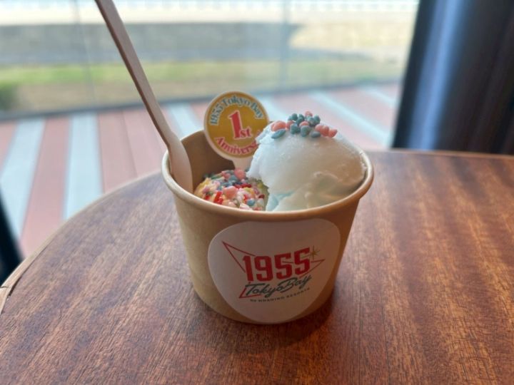 アイスクリームのサービスも発見!この日は1周年記念アイスとして、ソーダ味とバナナ味のダブルアイスにカラースプレーのトッピングをしたものが提供されました。