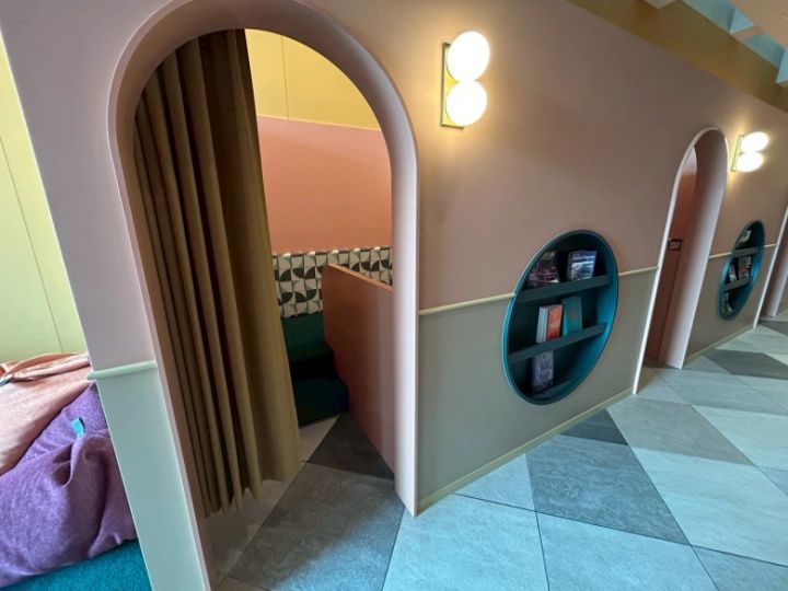 さらに、キッズスペースの隣にはカーテンつきの半個室スペースも増設。靴を脱いでプライベート空間を満喫できる、まるで秘密基地のようなスペースです! 周りの目が気になることもある小さな子連れ。こういった“自分たちだけの空間”は、使い勝手が良いですよね♪