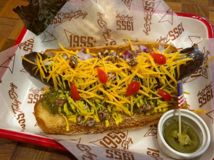 こちらはかなりボリューミーなビーフホットドッグ。アメリカンスタイルのスパイシーな牛肉のソーセージ200gに、チーズやキャラメリゼした胡桃がトッピング。フライドポテトもついていて、家族でシェアしながら食べても良さそう♡