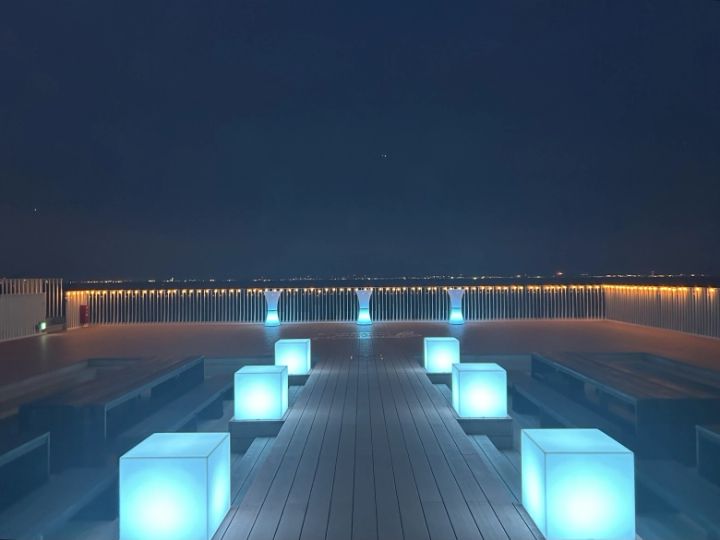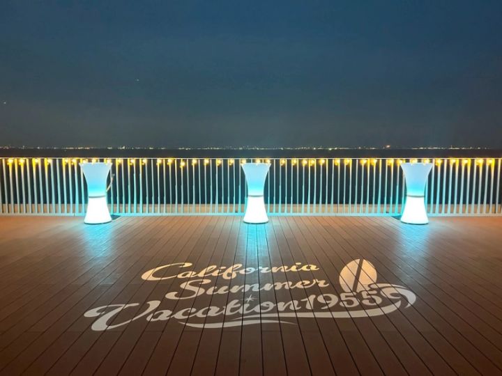 テラス全体がブルーにライトアップされ、サーフミュージックも流れています。まさに「チル」な空間で、バケーション気分も盛り上がります♪