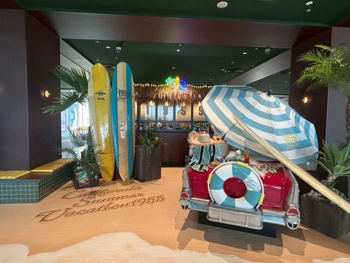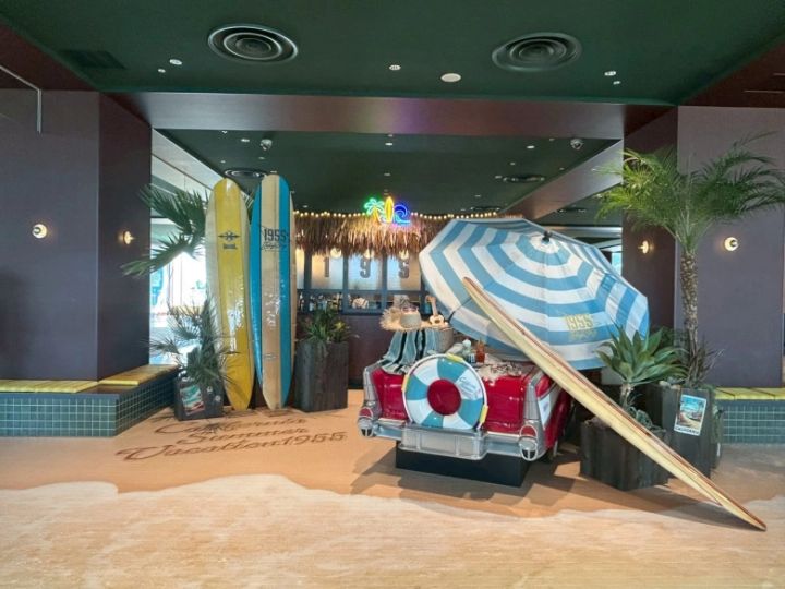 そして現在、ホテルでは9月15日までの期間限定イベントの「California Summer Vacation 1955」が開催中♡ 1950年代のカリフォルニアのサーフカルチャーをテーマにしており、ロビーには、こんな装飾が! コンシェルジュデスクはバーカウンター風になっていて、立てかけてあるサーフボードは、西海岸仕様のロングボード。まるでビーチにいるような雰囲気となっています♪