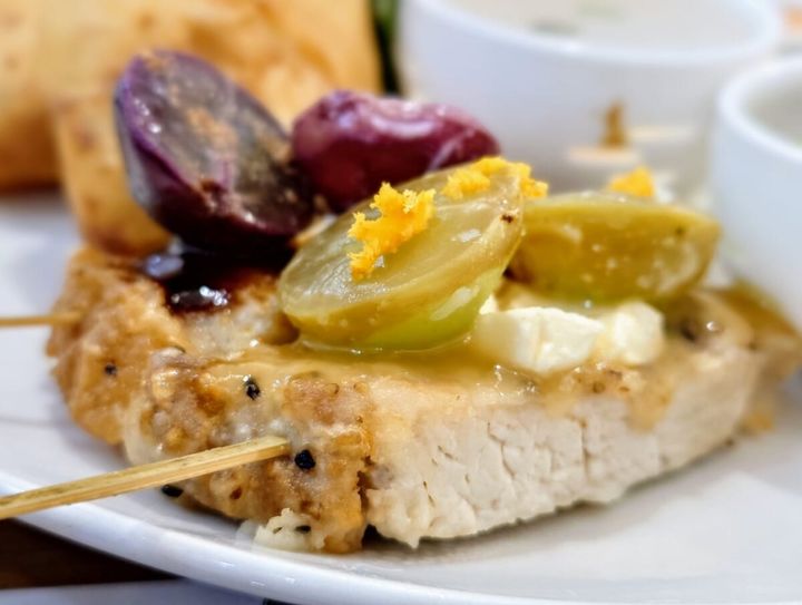 味噌田楽の土台はこんにゃくではなく岡山県産の豚「ピーチポーク」を使って、芳醇なピオーネ、爽やかなシャインマスカットの2種類あります。豚肉の上に味噌を塗り、クリームチーズとぶどうを重ねているという驚きの組み合わせ!