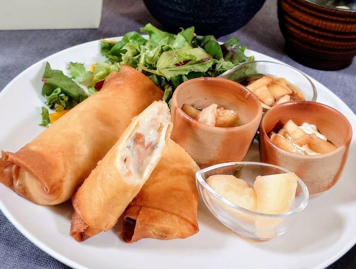 パリッとした春巻きの中には、ブルーチーズを使った濃厚なクリームソースがたっぷり入っています。チーズに桃のとろける食感が融合して、カスタードクリームのようなとろ〜っとした奇跡的な食感が生まれています!