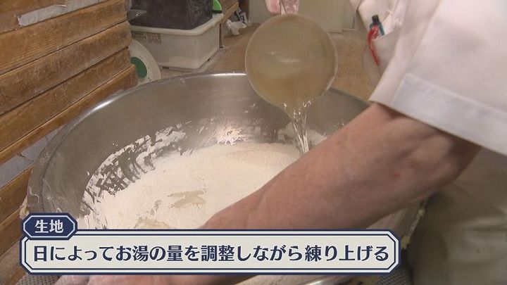 季節や気温によってお湯の量を調整しながら、生地を練り上げます。