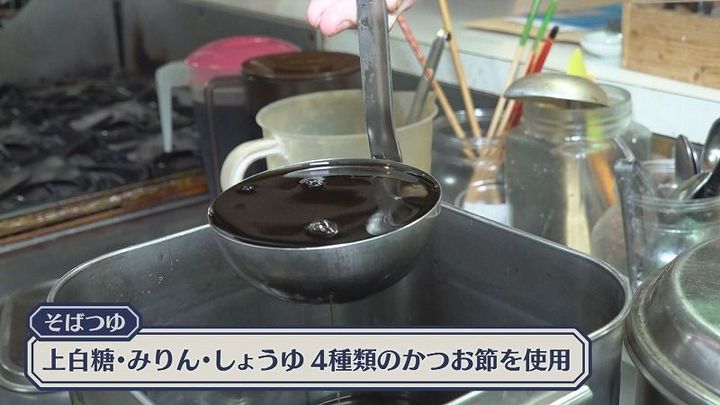 そばつゆは上白糖、みりん、しょうゆと4種類の鰹節を使用することで味に奥行きを出します。