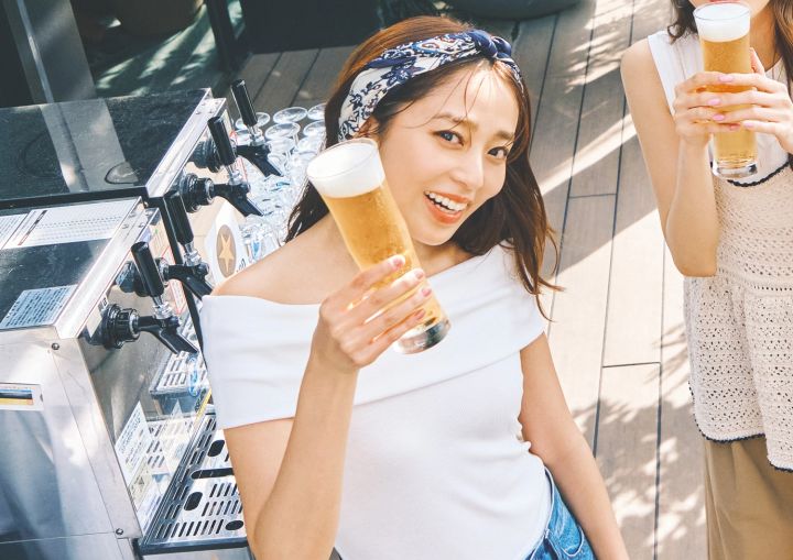 オフショル+ネイビーの柄スカーフを頭に巻いたハイテンションスタイルで、ビアガーデンへ。1枚でヘルシー&女っぽい印象になるオフショルは、二の腕がちょうど隠れるデザインなのも嬉しいポイント。