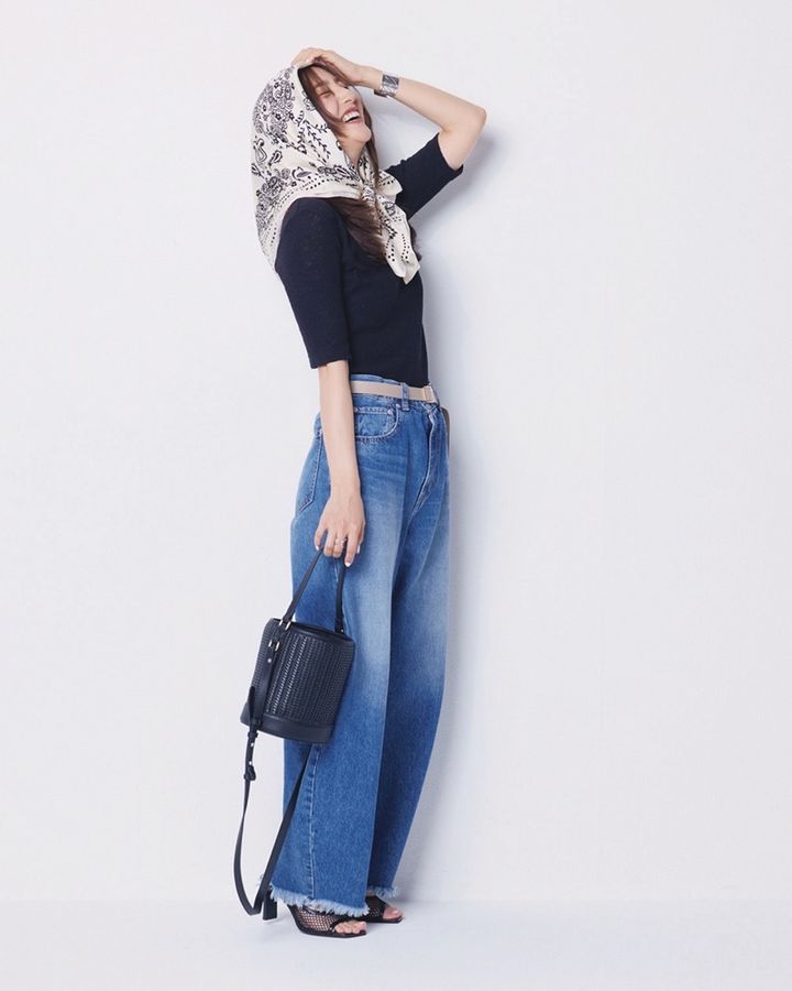 スカーフ¥22,000(マニプリ)ポロニット¥27,500(CLOSED/トヨダトレーディング プレスルーム)デニム¥27,500(ウォードブルー/ヤマツゥ)リング¥18,700(プラス ヴァンドーム)バングル¥47,850(ノース ワークス/UTSPR)ベルト¥13,200(LEFIJE/フラッパーズ)バッグ¥16,500(ツル バイ マリコ オイカワ)サンダル¥17,600(ダイアナ/ダイアナ 銀座本店)