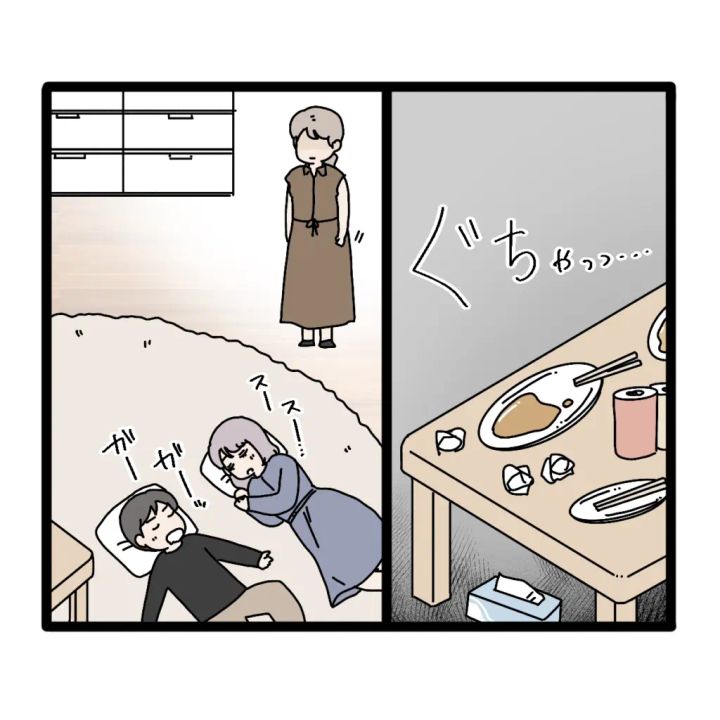 散らかったままのリビングにもげんなりしてしまいますが、妻がいる家の中で別の女性と平気で並んで寝ている伸介さんの気持ちがわかりませんね。